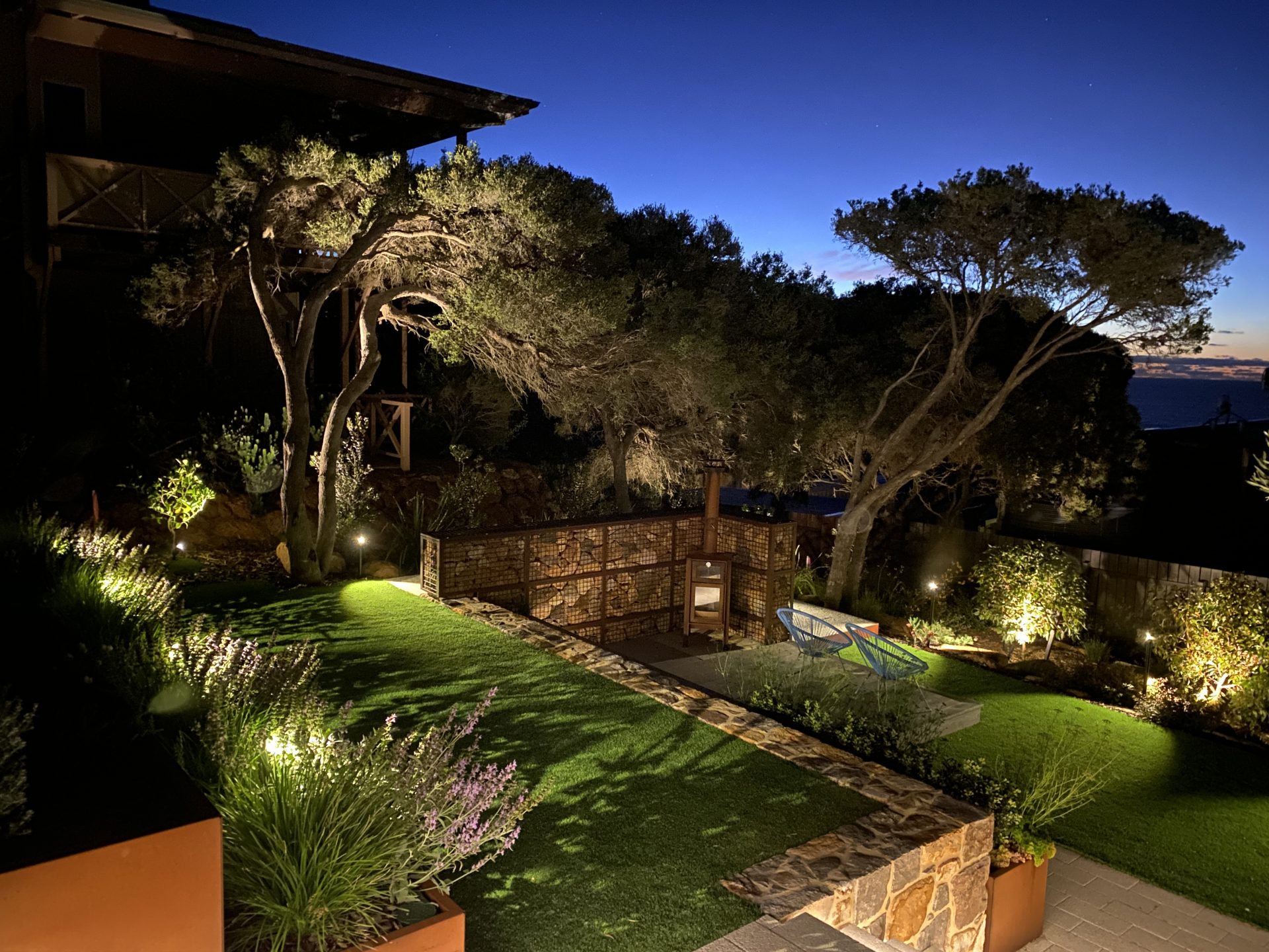 This Yallingup garden has been transformed into a standout nighttime experience. Soft uplighting sculpts the mature trees, while subtle ground and path lighting define levels, textures and movement through the space. Warm, carefully placed fittings highlight planting and stonework without overpowering the natural setting—creating depth, atmosphere and a sense of calm. As the client perfectly summed it up: “The garden is at another level at night.”